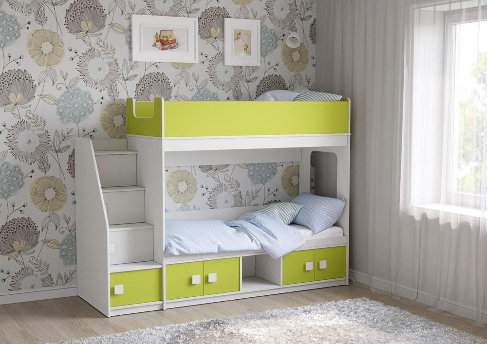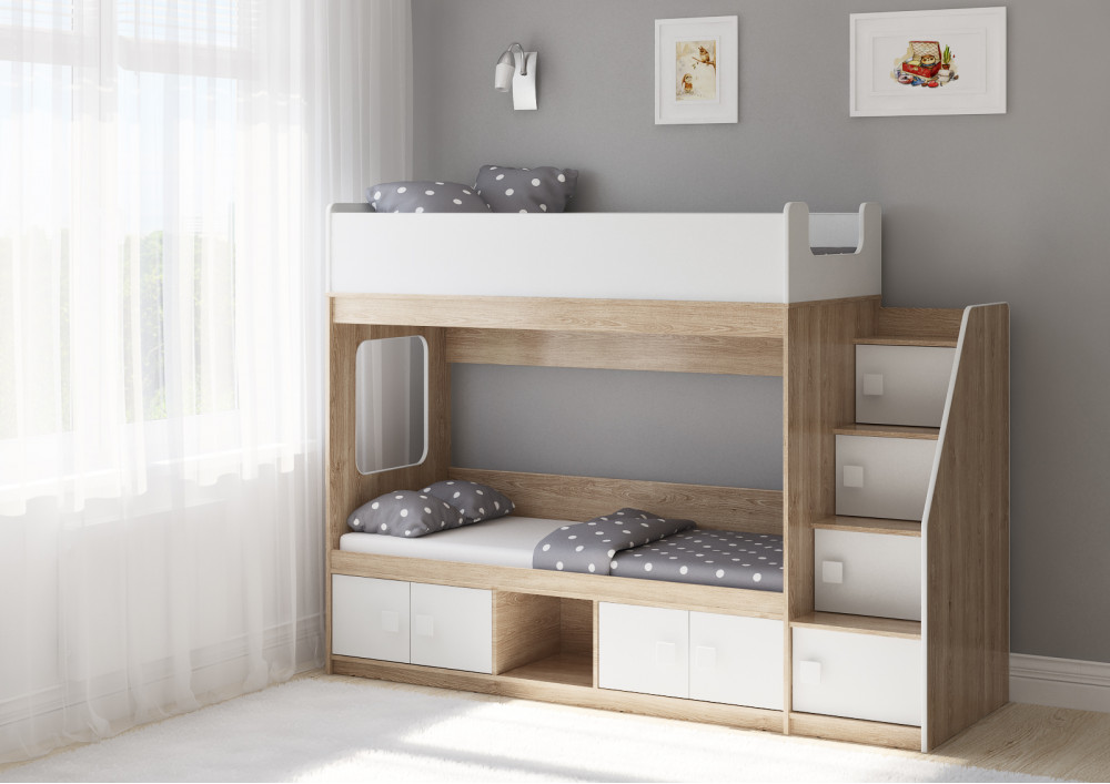 Классическая детская двухъярусная кровать с двумя параллельными спальными местами размером 1750х750 и 1900х750, закрытыми местами хранения и угловой лестницей-стеллажем.