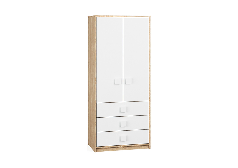Шкаф является двустворчатым, внутри две зоны с четырьмя полками и со штангой для «плечиков».
